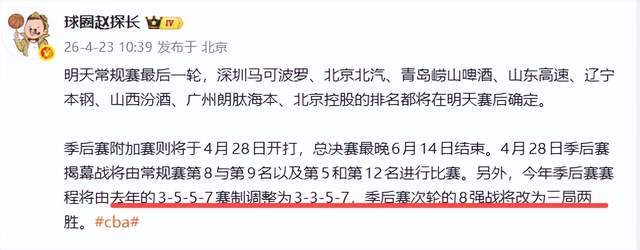北时间4月24日消息,2026年CBA季后赛赛制再度调整,次轮(1/4决赛)由“五局三胜”压缩为“三局两胜”,整体赛程从“3-5-5-7”变为“3-3-5-7”,附加赛将于4月28日开打,总决赛最晚6月14日落幕。这一变动引发球迷强烈质疑:“常规赛冗长低质,季后赛却草率缩水”,职业联赛的稳定性与竞技尊严正被持续侵蚀。