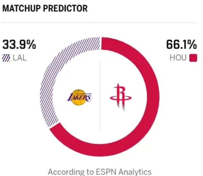 赛前,ESPN的数据模型预测,火箭赢球概率高达66.1%,湖人赢球概率只有33.9%!