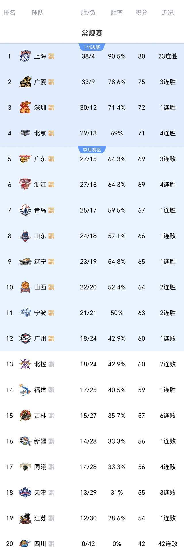 北京时间4月24日晚上,CBA常规赛最后一轮,10场比赛同时开打,宁波男篮94-78击败北控男篮、福建男篮93-91逆转广东男篮、广州男篮86-99不敌深圳男篮、江苏男篮89-108惨败辽宁男篮、青岛男篮94-84力克新疆男篮、山东男篮88-94惜败上海男篮、山西男篮116-96大胜同曦男篮、北京男篮105-55大胜吉林男篮、四川男篮81-104惨败浙江男篮、广厦男篮103-93战胜天津男篮。