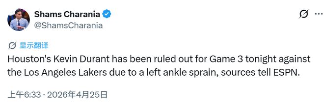 北京时间4月25日,据名记Shams报道,火箭球星杜兰特将因踝伤缺席今日G3的比赛。此前他被列为出战成疑,但经过赛前热身后,他确定无缘这场比赛。对于0-2落后的火箭来说,这无疑是巨大的打击。