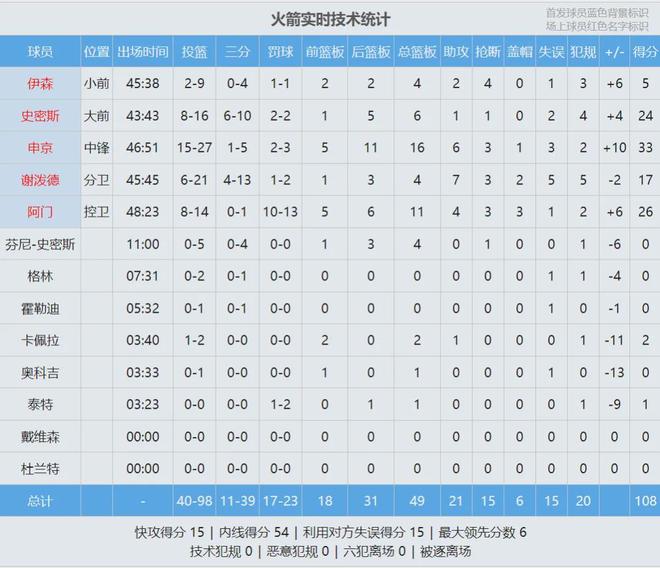 小贾巴里-史密斯三分2中2,今天手感本来不错。结果第一节还没打完,他就身背3次犯规,不满判罚被追加1个技犯。第一节打完,湖人39-32领先火箭7分。火箭替补芬尼-史密斯出战5分钟,2中0没得分,延续了常规赛的糟糕状态!