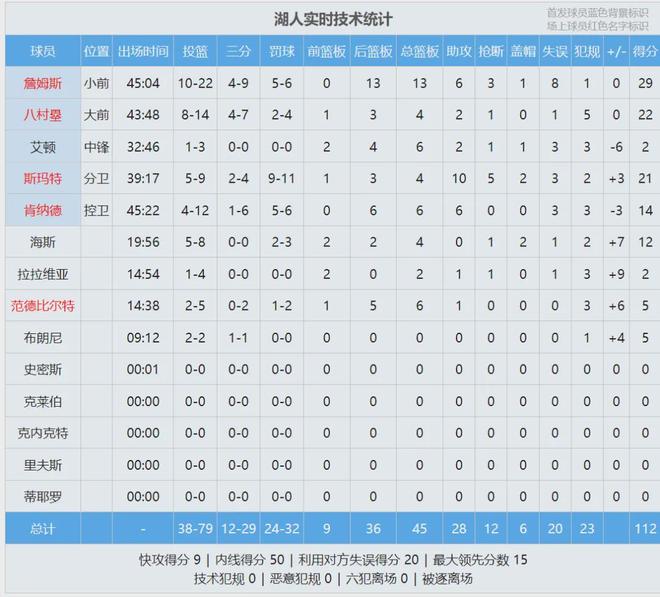 詹姆斯边线球失误,3.9秒火箭落后4分握有球权,伊森三分打铁。全场结束,湖人112-108战胜火箭,3比0领先拿到赛点。詹姆斯29分13板6助、八村塁22分、斯玛特21分10助5断2帽;申京33分16板、阿门26分11板、小贾24分!