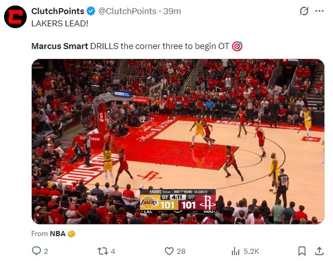 这场比赛湖人的赢球海报中心是马库斯-斯玛特,没错,又是缸哥,他上一场就是赢球第一功臣,他在末节与加时赛的表现实在是太出色了。