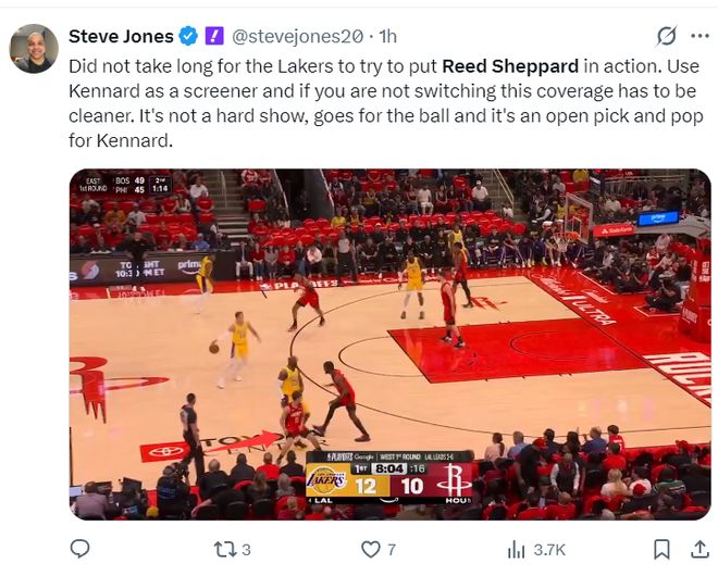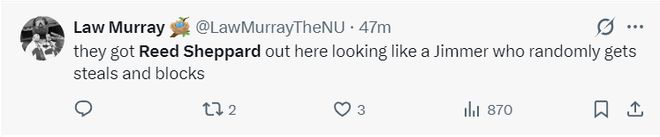 结果谢泼德不仅连续打铁还变成湖人的送分侠,湖人记者:湖人试图让谢泼德进入比赛,让肯纳德担任掩护球员,谢泼德根本做不到换防,实际上这并不是复杂的防守战术,但谢泼德不懂。肯纳德一持球突破队友就获得轻松上篮机会。