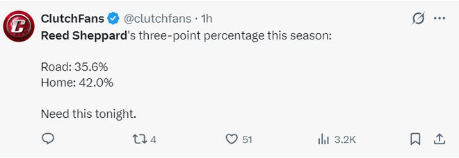 赛前休媒晒出谢泼德在主场三分命中率42%,赛季只有35.6%,他认为谢泼德会迎来爆发。
