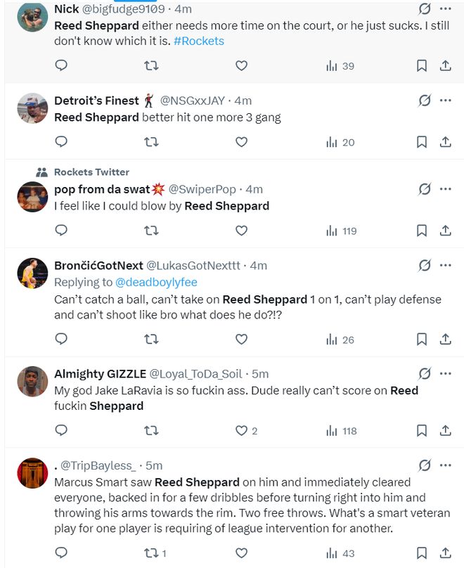 太多的火箭球迷对谢泼德忍无可忍了:1.连球都拿不住;2.篮下上篮都上不进;3.我觉得我都比谢泼德更强;4.实在是太差劲了,这还给他更多登场时间;