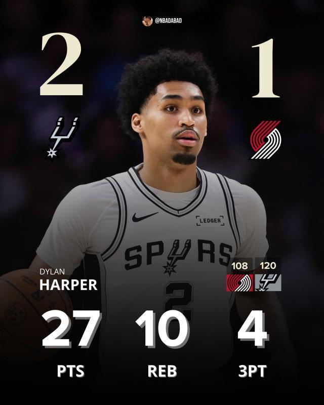 北京时间4月25日,波特兰开拓者主场108比120不敌圣安东尼奥马刺,系列赛1比2落后。此役马刺球星文班亚马缺阵,但新秀迪伦·哈珀下半场爆发,带领马刺完成15分逆转,赢得胜利。中国球员杨瀚森在比赛失去悬念的最后时刻登场,拿到一个后场篮板球。