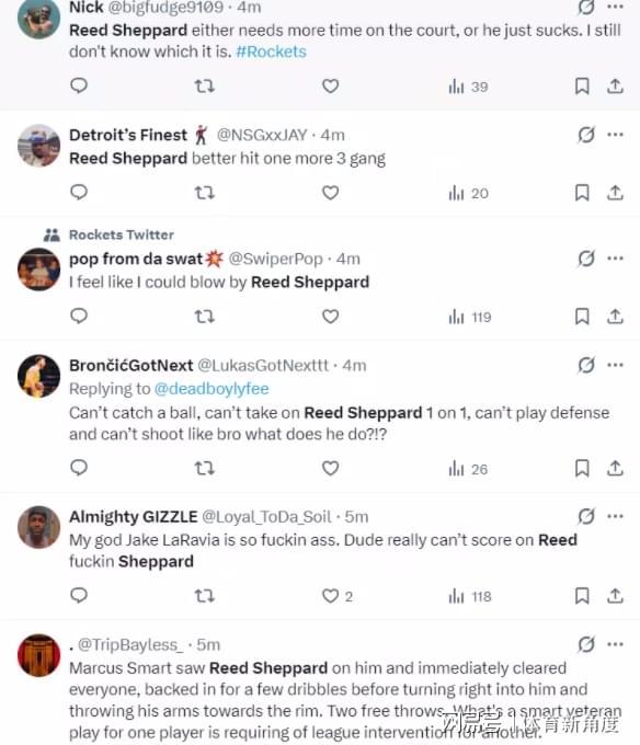 太多的火箭队球迷对谢泼德的表现感到忍无可忍,他们纷纷吐槽:“1. 他拿不稳;2. 篮下上篮都上不进;3.我觉得我都能比谢泼德打得更好。”4. 如此表现实在难以令人满意,实在不该再给予他更多的出场机会了;