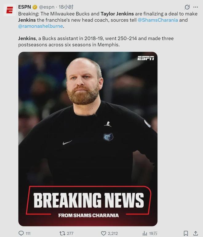 据ESPN名记Shams报道,雄鹿和泰勒-詹金斯敲定合同,詹金斯正式接替里弗斯,成为雄鹿新任主教练。雄鹿老板和管理层本周前往孟菲斯,和詹金斯进行了两次面谈。雄鹿老板认为,詹金斯擅长培养年轻球员,能够塑造球队文化!
