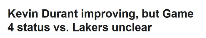 杜兰特早在系列赛首战就因右膝挫伤缺阵,G2迎来复出,出战41分钟砍下23分,球队94-101不敌湖人,而他在该场比赛末段意外扭伤脚踝。
