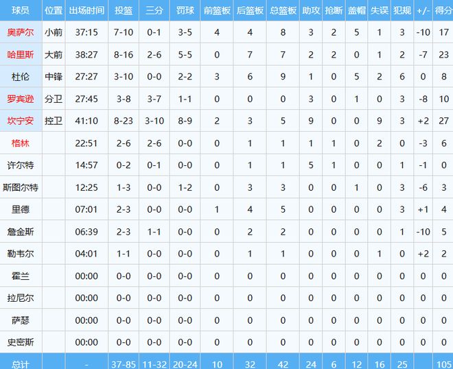 21届状元郎坎宁安投篮23中8贡献27分5板9助同时出现9次失误;内线核心杜伦投篮10中3,仅拿下8分9板准两双,唯一亮眼的就5帽数据。