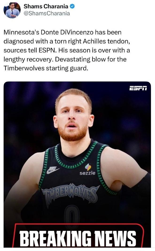 如今根据ESPN名记Shams Charania报道,据数位消息人士透露,迪文琴佐遭遇右跟腱撕裂,自然是宣告他已经赛季报销,对于森林狼自然是不小的打击。