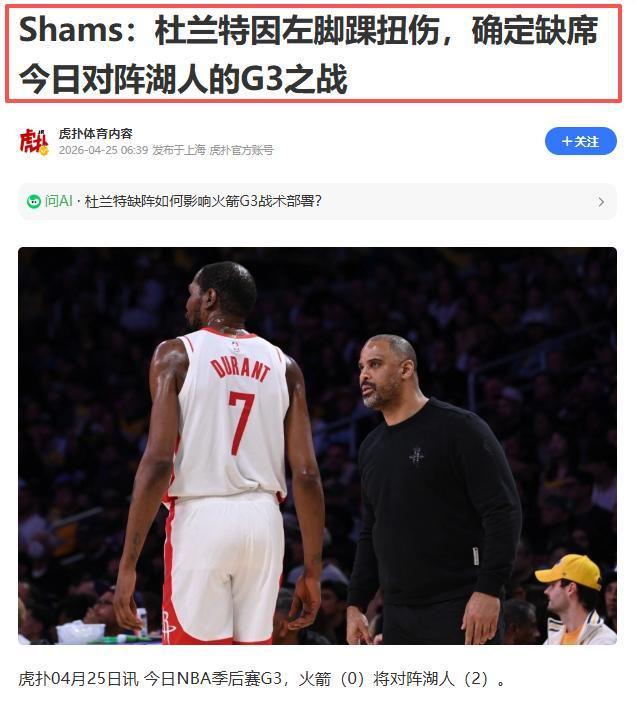虎扑体育:《Shams:杜兰特因左脚踝扭伤,确定缺席今日对阵湖人的G3之战》2026年4月25日北京青年报:《奥斯汀·里夫斯状态升级为出战存疑 有望在G3复出》2026年4月24日