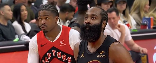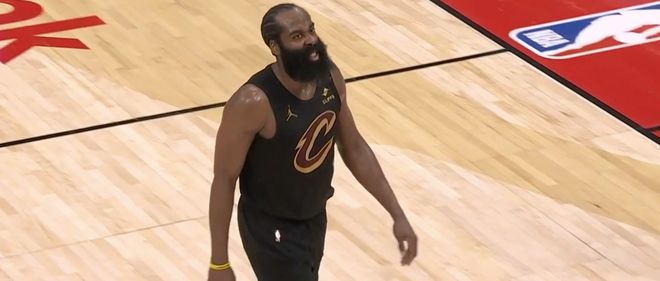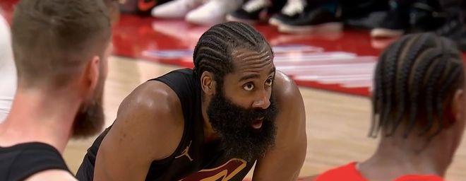 开场之后,莫布里吸引包夹及时传球,哈登空位三分,果断出手,稳稳命中,骑士取得3-2的领先。