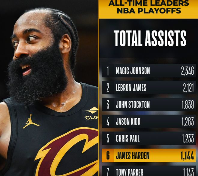 凭借这一次助攻,哈登迎来里程碑,独享NBA季后赛历史助攻榜的第六位。