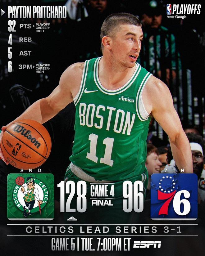 末节决战,凯尔特人延续着进攻端的出色表现,并将分差扩大至30分以上,76人追分乏力,比赛早早失去了悬念。两队逐渐换上板凳席末端的球员,时间很快走完。最终,波士顿以128比96完胜费城,将大比分改写为了3比1并就此夺下了赛点。双方的G5对决,将在凯尔特人主场进行。