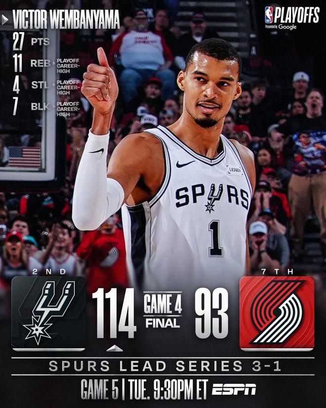 文班亚马在末节砍下了12分送出2次抢断,在攻防两端主导了比赛的走势。攻防一体的文班亚马,在此役打出了堪称惊艳和完美的表现。数据显示,文班亚马成为继2003年邓肯之后,首位在季后赛单场比赛至少拿下25分10板,且抢断+盖帽不少于10次的球员!