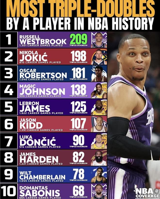 NBA历史三双榜最引人关注的,早就不再是前十名的大乱斗,而是威少的榜首宝座到底还能坐多久。目前威少以209次领跑,约基奇198次紧随其后,两人仅仅相差11次。