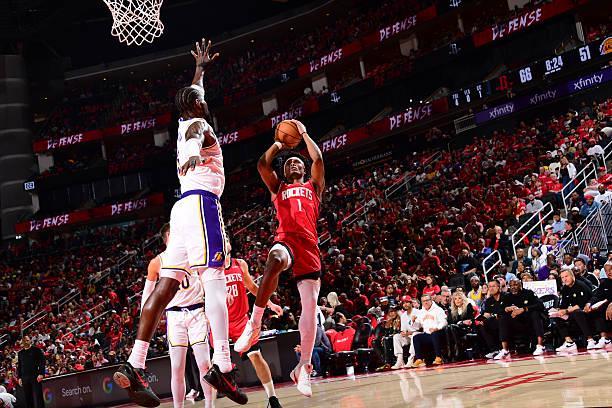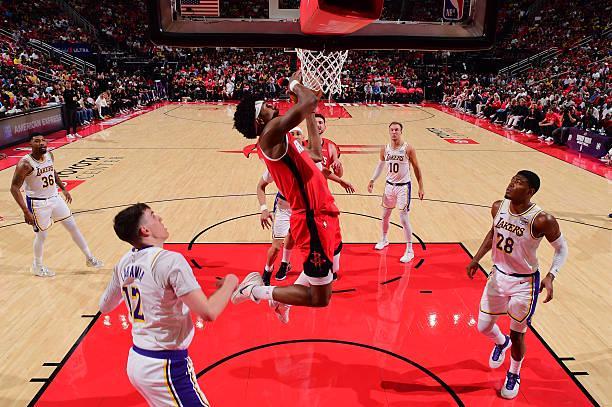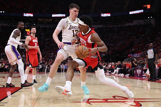 本场比赛中,火箭的先发后场新星阿门-汤普森(Amen Thompson)的表现还是相当不错的,他也是展现出了自己的特点。阿门全场出场40分33秒,投篮16中10,罚球3中3,得到了23分4篮板7助攻1抢断的数据,还有4次失误和2次犯规,正负值为+21。阿门在进攻端还是展现出了很强的冲击力,也是通过自己的努力得到了不少分数,展现出了自己在进攻端的特点。阿门也算是展现出了一定的传球能力和组织能力,在进攻端还是起到了不小的作用的。不过阿门在失误控制方面的表现依然是差了一些的,他也依然没有展现出投篮方面的能力。阿门在本场比赛中的表现其实还是有比较大的局限性的,只是湖人在攻防两端的状态都差了一些,没有给足强度,阿门也是打得顺风顺水。
