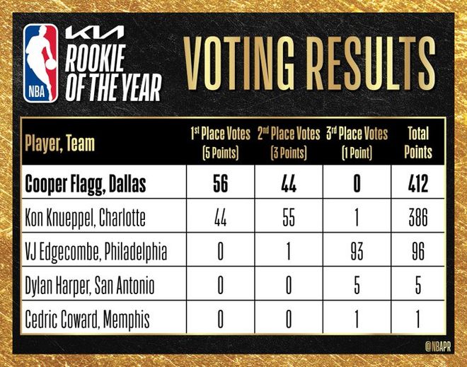 由100名成员组成的全球媒体评审团,投票选出了2025-26赛季起亚NBA年度最佳新秀。弗拉格得到56张第一选票,总分412分,克努佩尔得到44张第一选票,总分386分。本届前两名之间的得分差距为26分,是自2002-03赛季现行投票规则启用以来的历史第二小分差,仅次于2021-22赛季的15分差距(巴恩斯击败莫布利)。