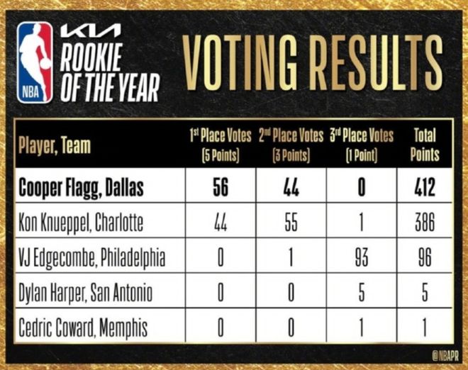 据统计,弗拉格拿到了56张第一选票,克尼普尔拿到了44张第一选票,弗拉格最终的得分是412分,克尼普尔则是386张,两人仅仅相差26分。在NBA历史上,其实有过两名球员共享年度最佳新秀球员奖的情况,不过这一次还是弗拉格赢了,他的表现和上限都更高。