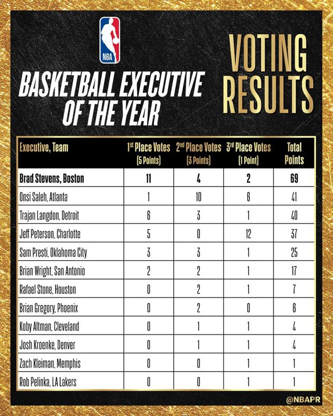 与NBA大多数赛季末重磅奖项不同,年度最佳高管由联盟各队高管投出,而非媒体评审。史蒂文斯获得11张第一选票,总得分69分登顶,排名第二的是老鹰总经理萨利赫,他得到41分,活塞总经理兰登获得40分,位居第三。