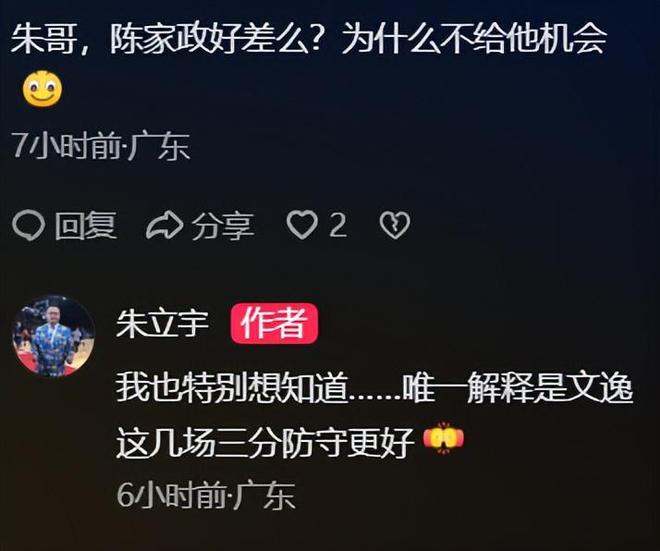 除了这个方面的原因外,关于陈家政无法上场还有另外一种解释,广东台知名解说员“朱立宇”也发表了个人见解,有球迷在评论区问朱立宇:陈家政表现好差么?为什么不给他机会?朱立宇回答:我也特别想知道...唯一的解释就是张文逸这几场的三分防守更好。