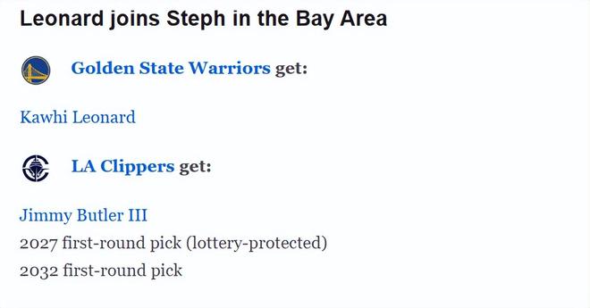 莱昂纳德完美适配巴特勒空缺,本赛季打出生涯最佳常规赛表现,上限甚至更高。两位球星薪资基本匹配,无需额外配平其他球员。