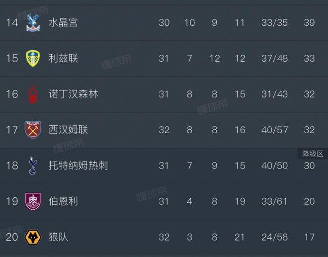 西汉姆联先赛一场,32轮积分达到32分追平诺丁汉森林,位列英超第17,热刺31轮积30分,排名跌至第18,进入到了英超降级区!