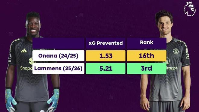23岁的拉门斯扼杀了对手的5.21个预期进球,排名英超第三。与之对比,2024/25赛季的奥纳纳,只减少了1.53球,排在英超第16位。在门将的本职工作方面,拉门斯完胜奥纳纳。