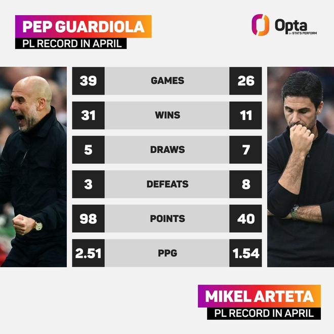 而另一方面,阿尔特塔带队在4月份打26场英超比赛,战绩为11胜7平8负,场均只拿1.54分,这是他场均拿分最少的月份。