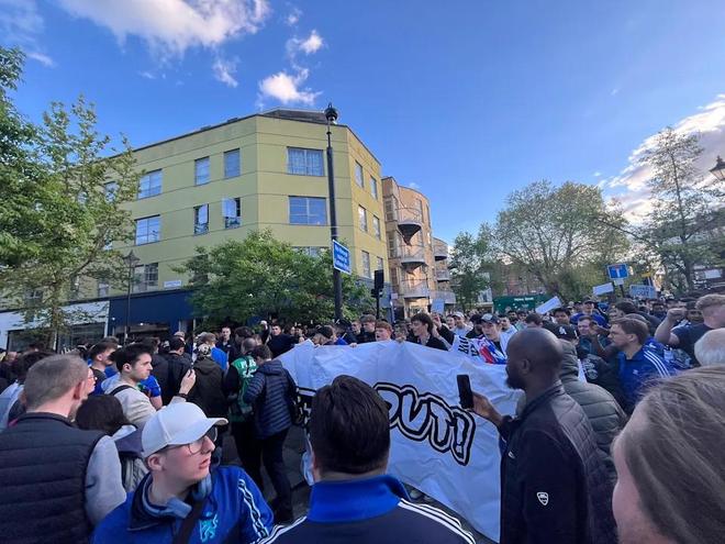 2026年4月18日,斯坦福桥球场外,切尔西球迷和一群从法国飞来的斯特拉斯堡球迷混在一起,喊着同样的口号。他们抗议的对象是BlueCo——两家俱乐部共同的老板。