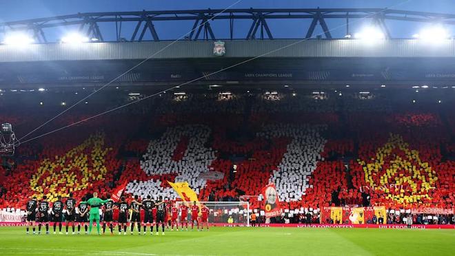 周二对阵巴黎圣日耳曼的欧冠比赛, tribute(致敬)被前置到开球前:全场默哀、球员佩戴黑纱、Kop看台拼出马赛克图案。