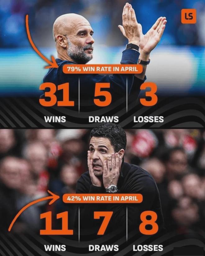 恰好相反的是,4月却是阿尔特塔执教阿森纳表现最差的月份,历史战绩是11胜7平8负,胜率仅有42%。以上种种,都会带给曼城球员更多的信心,同时让阿森纳全队上下承受更大的压力。