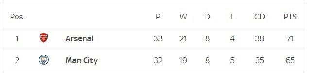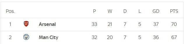 在33轮之后,阿森纳以70分继续领跑,但仅领先少赛一场的曼城3分。同时,在净胜球方面,阿森纳也以1球的优势领先。