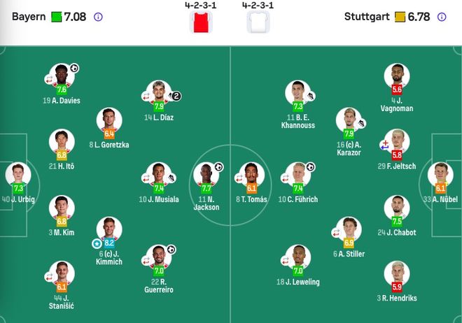 拜仁首发:40-乌尔比希、3-金玟哉、19-阿方索·戴维斯(62' 27-莱默尔)、21-伊藤洋辉、22-格雷罗(76' 39-恩迪亚耶)、44-斯坦尼西奇、6-基米希、8-格雷茨卡、10-穆西亚拉(46' 9-凯恩)、11-杰克逊、14-迪亚斯(46' 17-奥利塞)