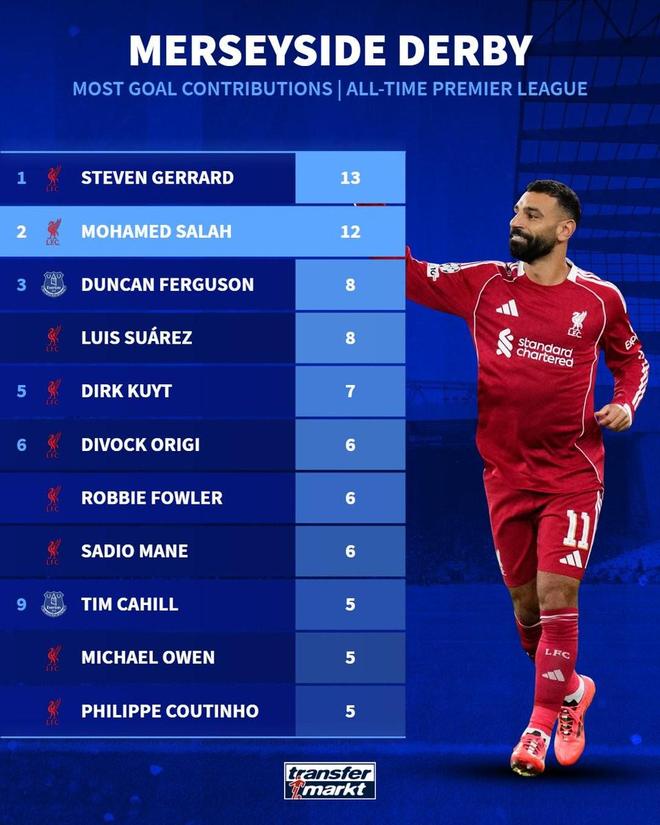 赛后德转列出了英超默西塞德德比历史上直接参与进球数最多的11名球员,萨拉赫以12球位列第二。