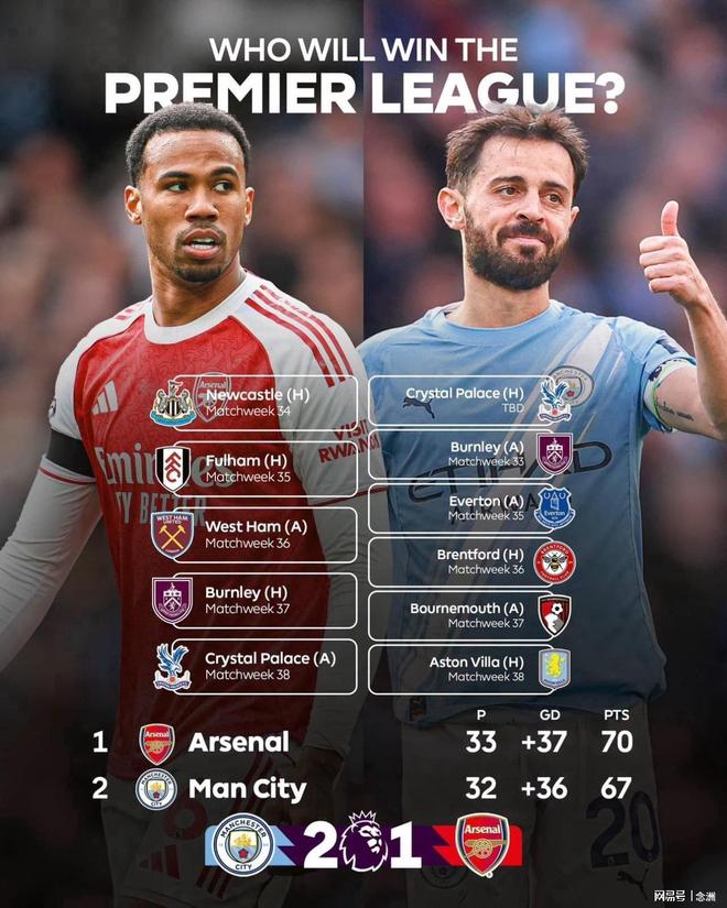 先看最新积分榜:阿森纳33轮70分,净胜球37球、总进球63球;曼城32轮67分,净胜球36球,总进球65球。根据规则,同分情况下依次比较:净胜球、进球数、相互战绩、相互对阵客场进球数,若全部相同,则在中立场地进行附加赛。但曼城相互战绩1胜1平占优,所以已经排除用附加赛角逐冠军的情况。