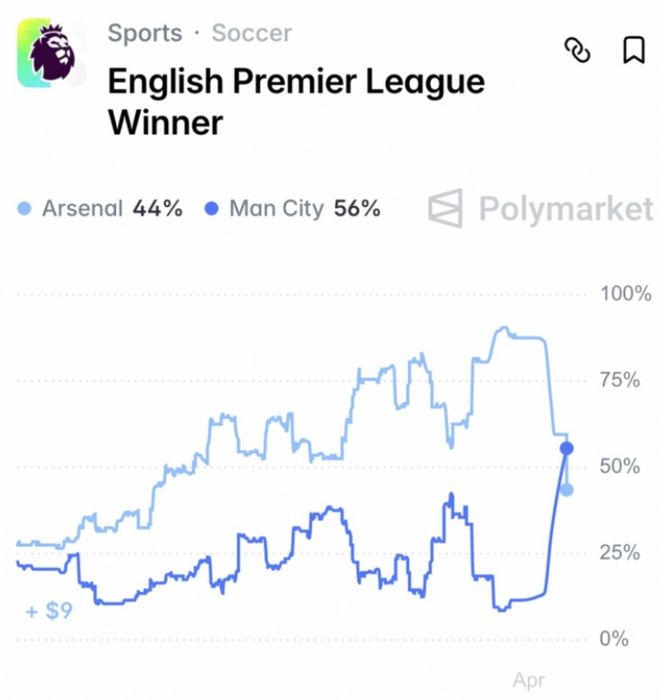 曼城在本轮联赛2-1战胜阿森纳后,争冠形势迎来巨大反转。据Polymarket最新夺冠概率数据,曼城以56%反超阿森纳,枪手当前夺冠概率仅为44%。
