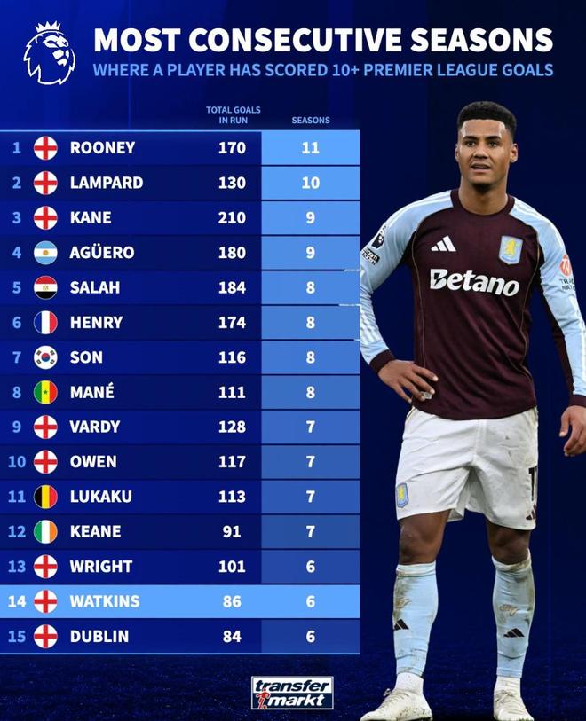 北京时间4月20日,德转统计出了英超历史连续最多赛季进球数上双的15名球员,鲁尼、兰帕德、哈里-凯恩位列前三,上周末达成本赛季英超进球10+的沃特金斯上榜。