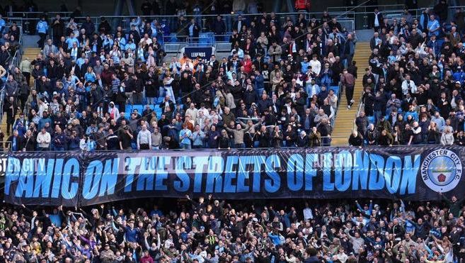 全场比赛结束之后,曼城球迷打出了巨大的横幅," 伦敦街头一片恐慌 "