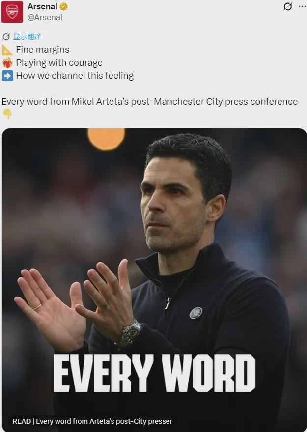 赛后新闻发布会很短,阿尔特塔看来也不想多说,这时候行动比言语更重要。