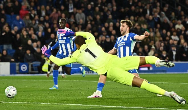 比赛刚刚开始不久,布莱顿就创造出非常好的机会。格罗斯在右侧起球传中。皮球飞到后点。三笘薫前插,直接凌空射门。门将反应很快把球扑了出去。第3分钟,切尔西丢球了!哈托头球解围,皮球恰好来到卡迪奥卢身前。卡迪奥卢直接推射,球进了!布莱顿取得梦幻般的开局。第14分钟,范赫克抢点头球攻门。门将单掌把球扑出。