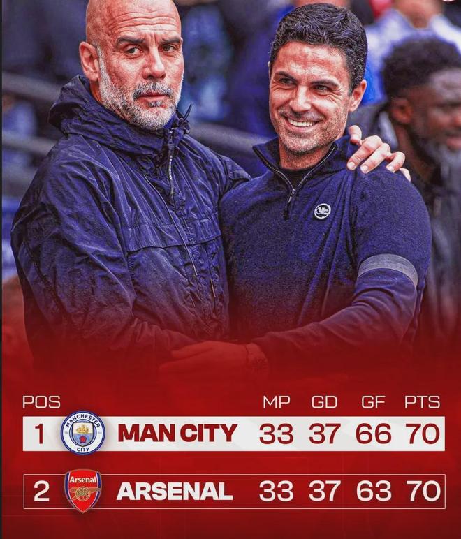 双方的净胜球甚至都是一样的,同是70分,同是37个净胜球,甚至要用进球数来分胜负,可见差距有多小……但就在不久前,阿森纳其实还领先9分的……