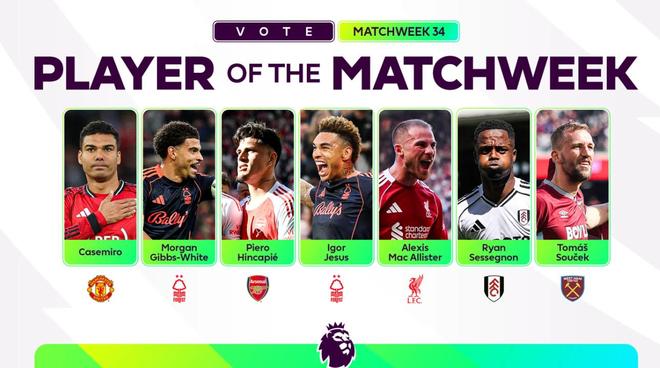 2025-2026赛季英超第34轮,诞生了多场亮眼的个人发挥。英超联赛官方筛选出七位最佳球员,邀请球迷投票,选出本轮英超最佳球员,其中包括曼联中场卡塞米罗、诺丁汉森林队长摩根-吉布斯-怀特、阿森纳后卫因卡皮耶、森林前锋伊戈尔-热苏斯、利物浦中场麦卡利斯特、富勒姆边后卫瑞恩-塞塞尼翁以及西汉姆联中场绍切克。