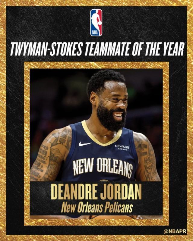 NBA官方宣布,鹈鹕中锋德安德烈·乔丹当选本赛季最佳队友!值得一提的是,小乔丹(1445分)以8分的微弱优势险胜该奖项3届得主——朱·霍勒迪(1437分);排名第三的为火箭前锋杰夫·格林(1420分)该奖项候选人还有:贝恩(魔术)、布伦森(尼克斯)、康诺顿(黄蜂)、福克斯(马刺)、杰夫·格林(火箭)、朱·霍勒迪(开拓者)、小乔丹(鹈鹕)、邓肯·罗宾逊(活塞)、斯玛特(湖人)、塔图姆(凯尔特人)、坦普尔(猛龙)、杰林·威廉姆斯(雷霆)。以上12名候选人(东西部各6人)为球队高管选出,而对这12人进行投票的则是现役NBA球员。特威曼·斯托克斯年度最佳队友奖自2012-13赛季开始颁发,是以曾在1955-1958年期间一起效力于罗彻斯特/辛辛那提皇家队的杰克·特威曼和莫里斯·斯托克斯来命名的奖项,旨在表彰在场上无私奉献、在场内外展现领导力、作为其他NBA球员的导师和榜样,并对球队展现高度责任感和奉献精神的球员。